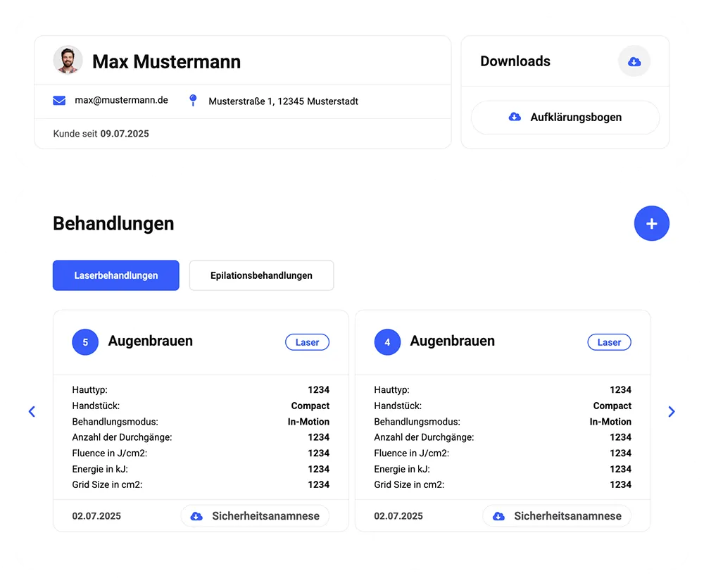 Alle Einverständnisse, Behandlungsverläufe und Geräteparameter als fertiges PDF – verschlüsselt, downloadbar, jederzeit nachweisbar.